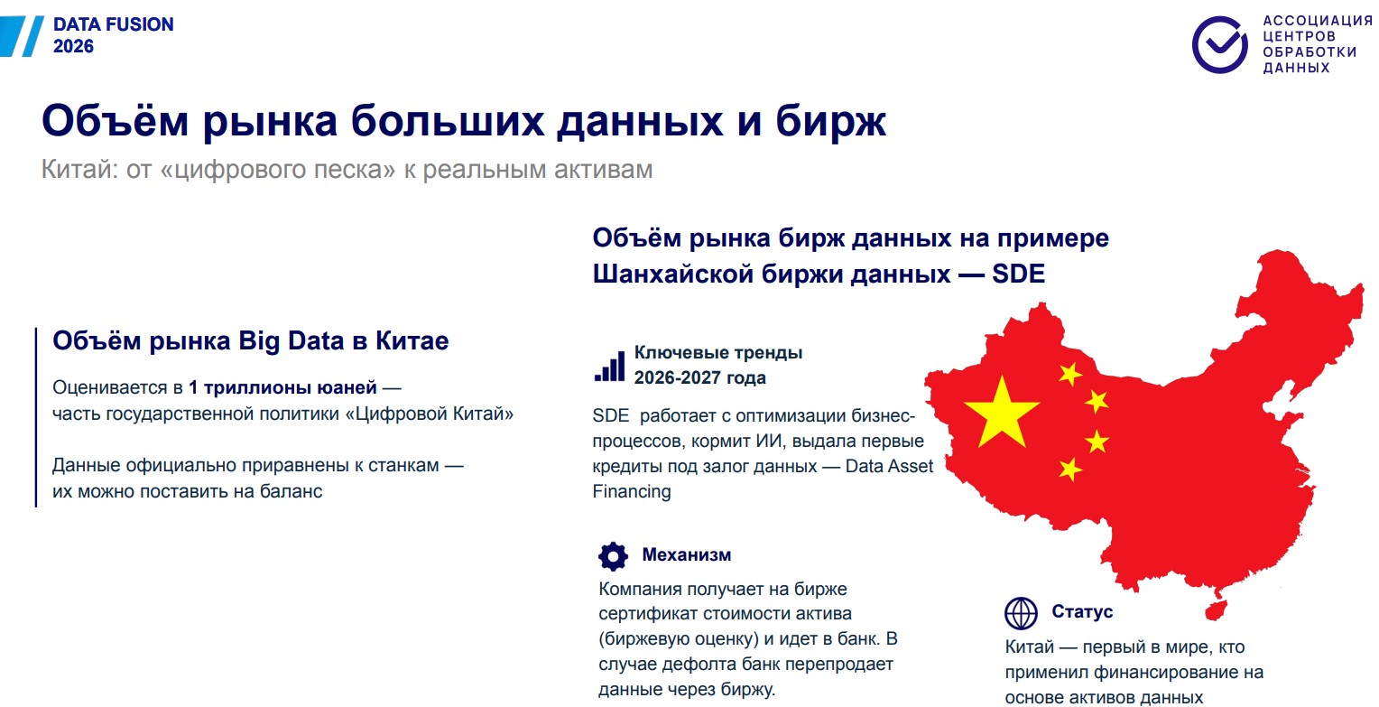 Китай оценил объем рынка больших данных в 1 трлн юаней, а одним из инструментов этого рынка является Шанхайская биржа данных (Shanghai Data Exchange, — SDE), перезапущенная в 2021 году. Биржа насчитывает более 5 000 зарегистрированных продуктов данных, а объём ее торгов превысил 4 млрд юаней.